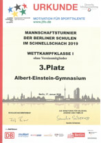 Am 17. Januar 2019 fand in der Max-Planck-Oberschule das Berliner Schnellschachturnier statt, an dem in 61 Mannschaften knapp 280 Schüler*innen in 4 Wettkampfkategorien teilgenommen haben. Gespielt wurden insgesamt 5 Runden mit einer Bedenkzeit von jeweils 15 Minuten pro Spieler*in/Spiel. Wir vom Albert-Einstein-Gymnasium waren zum ersten Mal bei dem Turnier mit dabei und konnten zwei klassenübergreifende Mannschaften stellen.