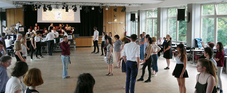 An einem Mittwochabend haben wir uns in diesem Jahr zusammengefunden, um gemeinsam zu tanzen und die großartige Musik der Big Band zu genießen. Zunächst haben Frau Große und Herr Hartelt uns verschiedene Basic-Schritte beigebracht, damit wir auch tanzen können. Dabei handelte es sich um zum Beispiel den Foxtrott. Als wir dann die Schritte drauf hatten, konnte die Big Band richtig anfangen zu spielen und wir hatten die Möglichkeit zu tanzen.